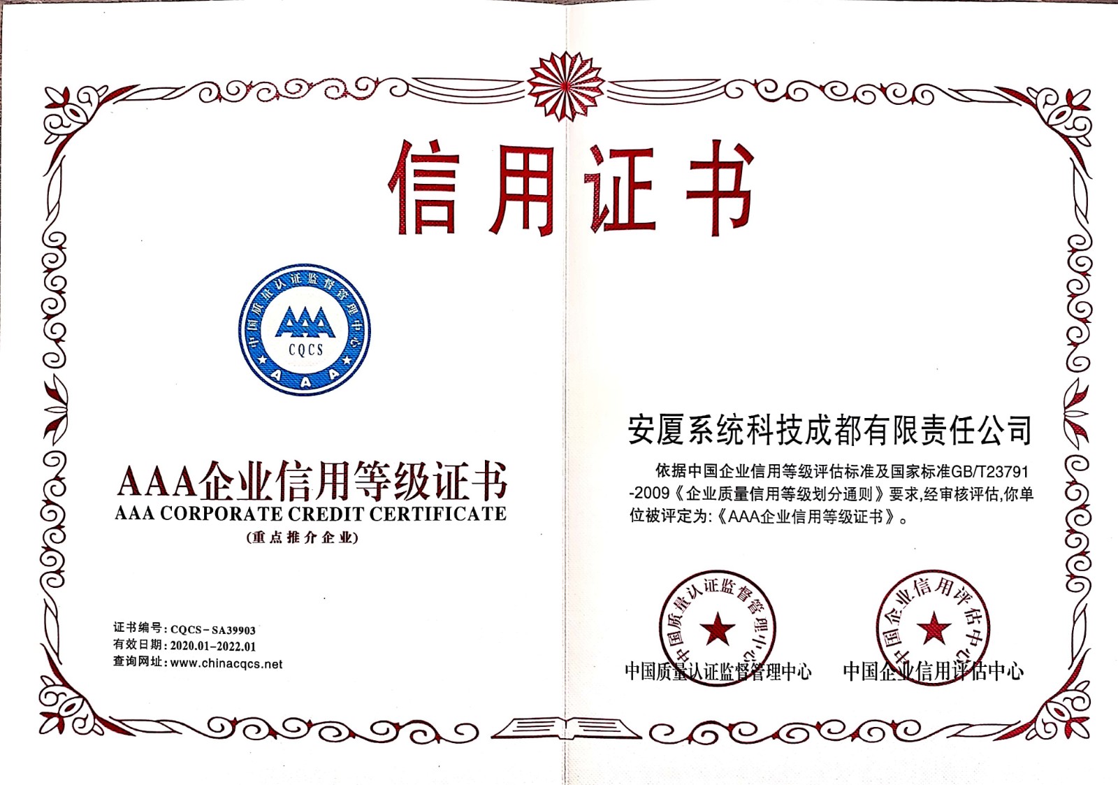 • 3A企業(yè)等級(jí)認(rèn)證證書(shū)