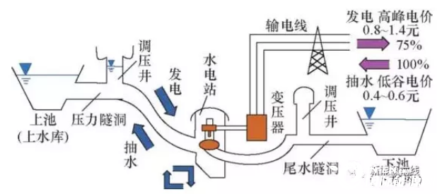 電網(wǎng)低谷時(shí)利用過剩電力將作為液態(tài)能量媒體的水從低標(biāo)高的水庫抽到高標(biāo)高的水庫,電網(wǎng)峰荷時(shí)高標(biāo)高水庫中的水回流到下水庫推動(dòng)水輪機(jī)發(fā)電機(jī)發(fā)電。