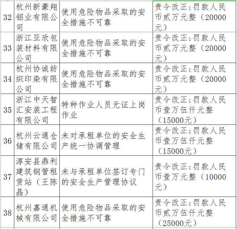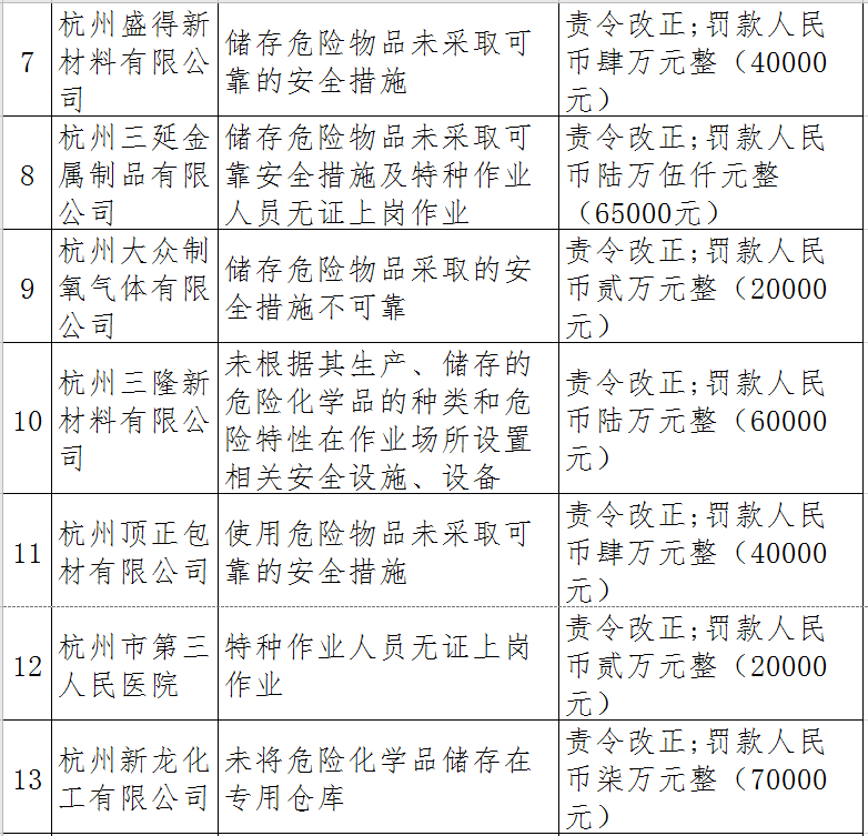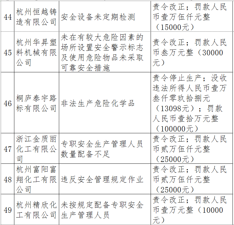 據(jù)了解,今年上半年,杭州市應(yīng)急管理局一手抓駐企復工復產(chǎn)、一手抓安全生產(chǎn),已完成年度執(zhí)法計劃、專項檢查、聯(lián)合執(zhí)法、信訪舉報核查等,并對檢查中發(fā)現(xiàn)的安全生產(chǎn)違法違規(guī)企業(yè)(個人)進行了處罰。現(xiàn)對52家被行政處罰的企業(yè)(個人)進行曝光,希望各企業(yè)引以為戒!